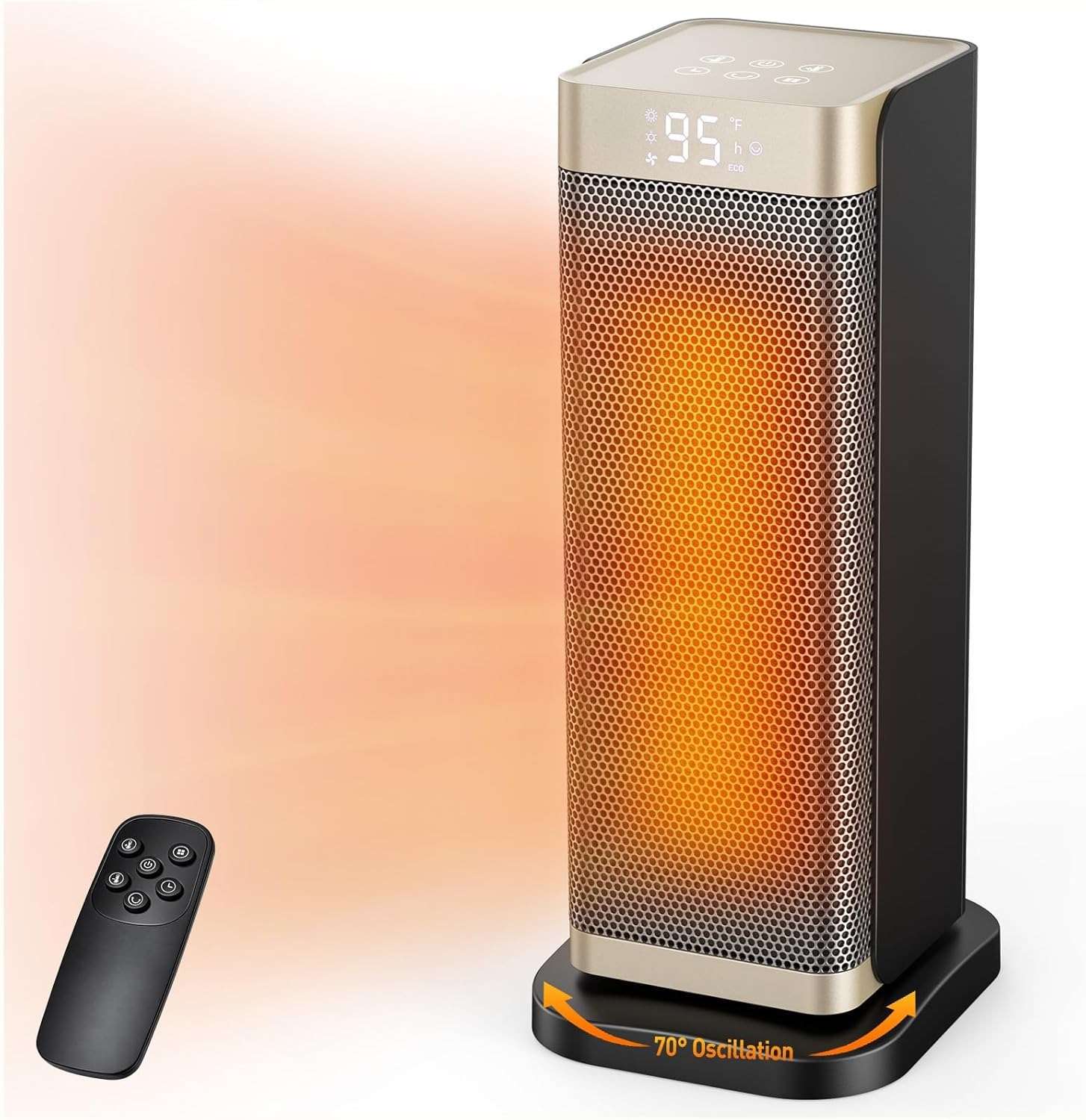 Heating Performance & Power: Delivers 1500W PTC ceramic heating for instant warmth within 3 seconds, with multiple power settings. Safety Features & Certifications: ETL-certified with tip-over protection, overheat protection, and made from flame-retardant materials. Controls & Usability: Offers a space-saving design with easy top touchscreen controls and a remote for convenience. Design & Mobility: Features 70° wide-angle oscillation for even heat distribution and a portable design. Energy Efficiency & Noise: Smart ECO mode precisely maintains temperature by adjusting heat, reducing energy consumption.