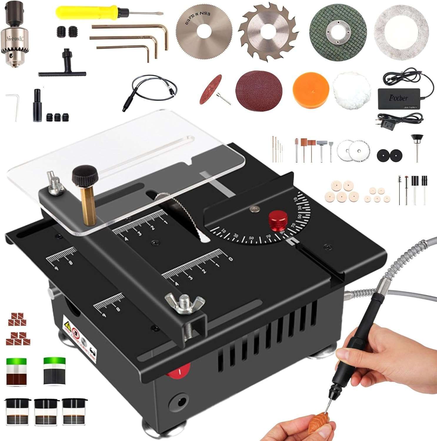 96W motor suitable for miniature woodworking and precision jobs.Adjustable angle and depth for custom, accurate work.